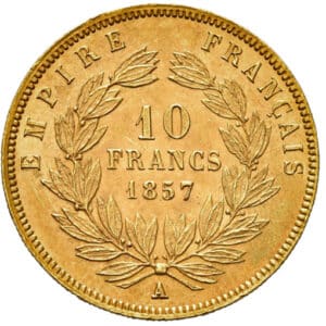 Al termine della Seconda Repubblica francese, di cui il futuro Napoleone III ne fu presidente, la Francia torna ad avere un imperatore e così anche i 20 franchi d’oro cambiano design ponendo sul dritto il volto del sovrano, come tradizione per le monarchie.
