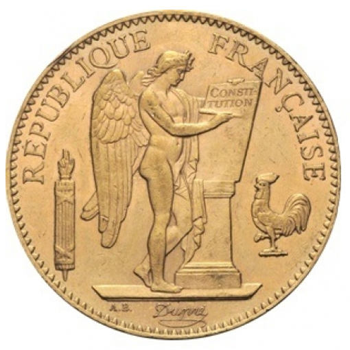 Dopo la caduta di Napoleone III e la restaurazione della Repubblica, solo a partire dal 1878 la zecca di Parigi è tornata a produrre i 100 franchi d’oro. L’esemplare qui esposto del 1907 viene chiamato anche “Genio della Repubblica” per via della figura rappresentata sul dritto. Le monete da 100 franchi d’oro di tipo Genio saranno coniati fino al 1914, anno in cui scoppiò la prima guerra mondiale e vide proprio la Francia uno dei Paesi più coinvolti nel conflitto.