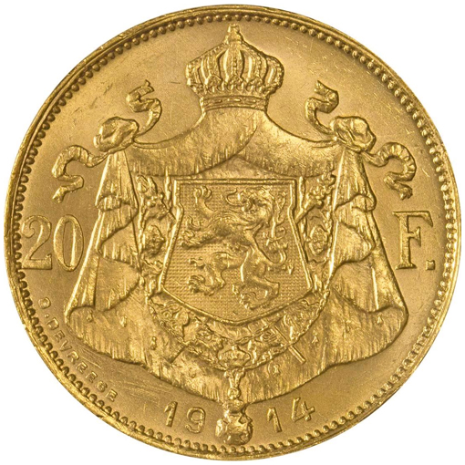 • Rovescio (Retro): Presenta lo stemma coronato del Belgio che divide la cifra del valore, 20 F (20 Franchi), con l’anno di coniazione, 1914, in basso.