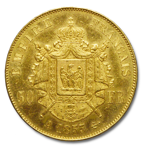 • Rovescio (Retro): Mostra lo stemma imperiale (l’aquila su un fulmine) circondato dal mantello d’ermellino e sormontato dalla corona imperiale. Ai lati, il valore nominale 50 FRs e in basso l’anno 1855. La dicitura è EMPIRE FRANÇAIS.