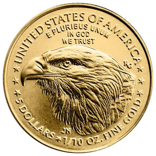 Sul dritto dell’American Eagle d’oro da 1/10 oz è disegnata la personificazione della Libertà, ad opera di Augustus Saint-Gaudens, che realizzò l’opera nel 1907. Lady Liberty ha una torcia nella mano destra che si stende verso l’alto, come se fosse in procinto di illuminare gli Stati Uniti. Nella mano sinistra tiene in mano il ramo d’ulivo della pace. Alla sua sinistra in basso possiamo osservare il Campidoglio. In alto campeggia la scritta “LIBERTY”, mentre tutto intorno ci sono 50 stelle che indicano le 50 nazioni che compongono gli Stati Uniti d’America.
