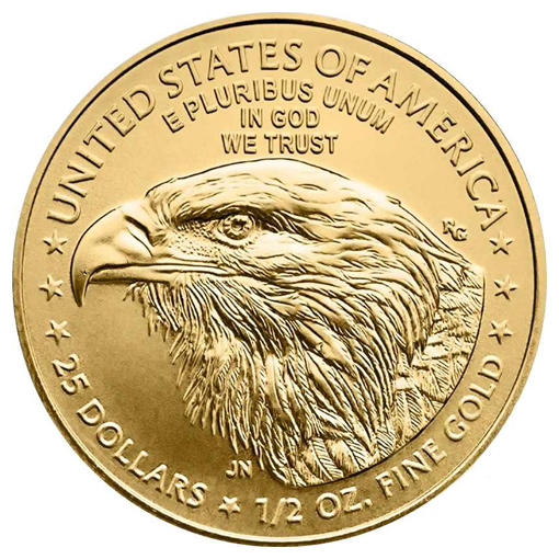 Sul dritto dell’American Eagle d’oro da 1/2 oz è disegnata la personificazione della Libertà, ad opera di Augustus Saint-Gaudens, che realizzò l’opera nel 1907. Lady Liberty ha una torcia nella mano destra che si stende verso l’alto, come se fosse in procinto di illuminare gli Stati Uniti. Nella mano sinistra tiene in mano il ramo d’ulivo della pace. Alla sua sinistra in basso possiamo osservare il Campidoglio. In alto campeggia la scritta “LIBERTY”, mentre tutto intorno ci sono 50 stelle che indicano le 50 nazioni che compongono gli Stati Uniti d’America.